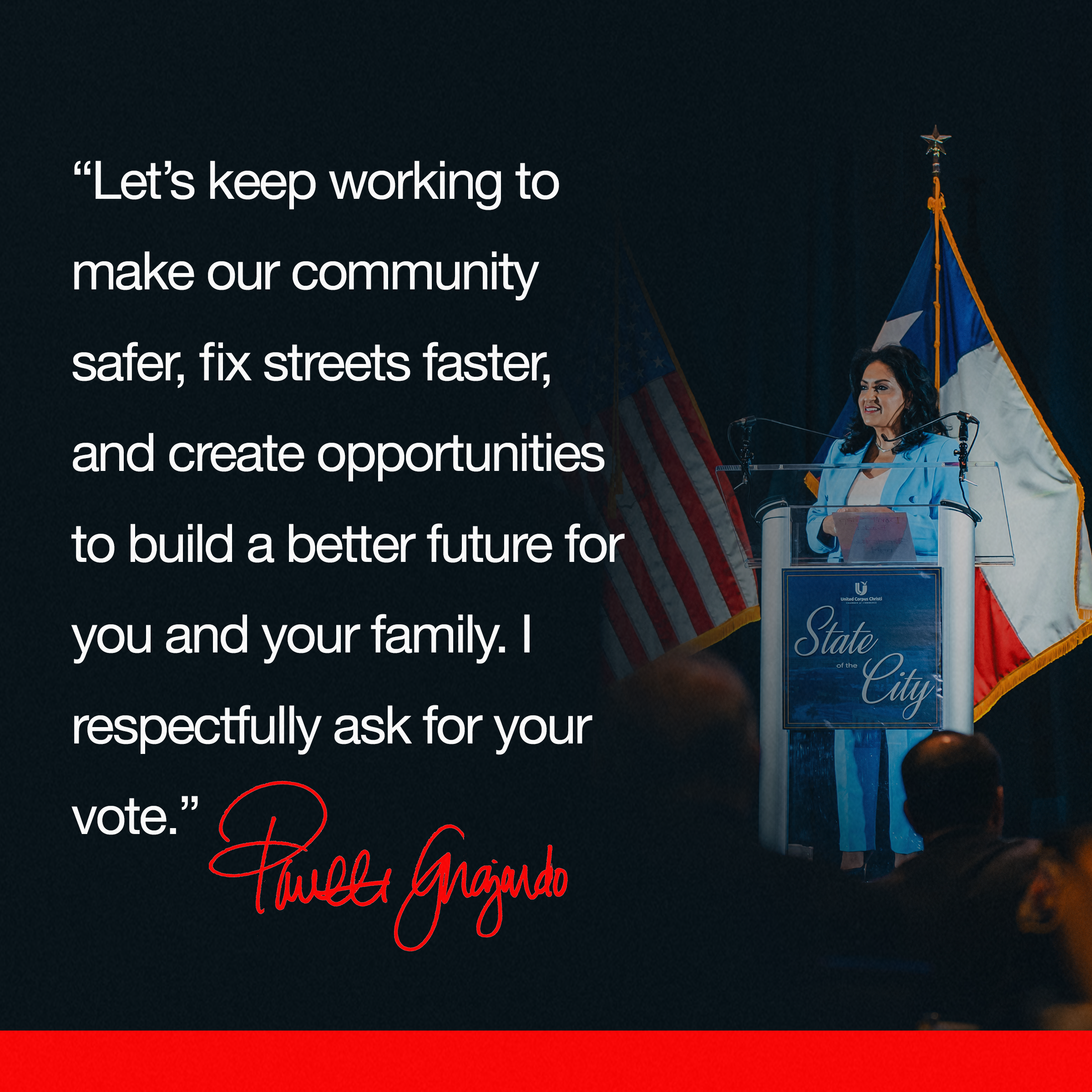 Just like the state itself, elections in Texas are big—especially in Corpus Christi, the 8th largest city in the state. I was brought on to lead every aspect of the 2024 re-election media campaign for Mayor Paulette Guajardo, this was a high-pressure, high-visibility race. With rapid development reshaping the city and real progress finally taking root, the creative had to meet the moment. The full visual strategy included cinematic broadcast ads, endorsement videos, citywide billboards, digital rollouts, live event coverage, and contrast ads against a strong challenger—some of which included bilingual messaging to reflect the city’s audience. The election was fiercely competitive, and the creative had to cut through the noise. In a city where change was finally becoming visible—not just promised—my role was to make sure voters could see it, feel it, and believe in it. And most importantly, we won!